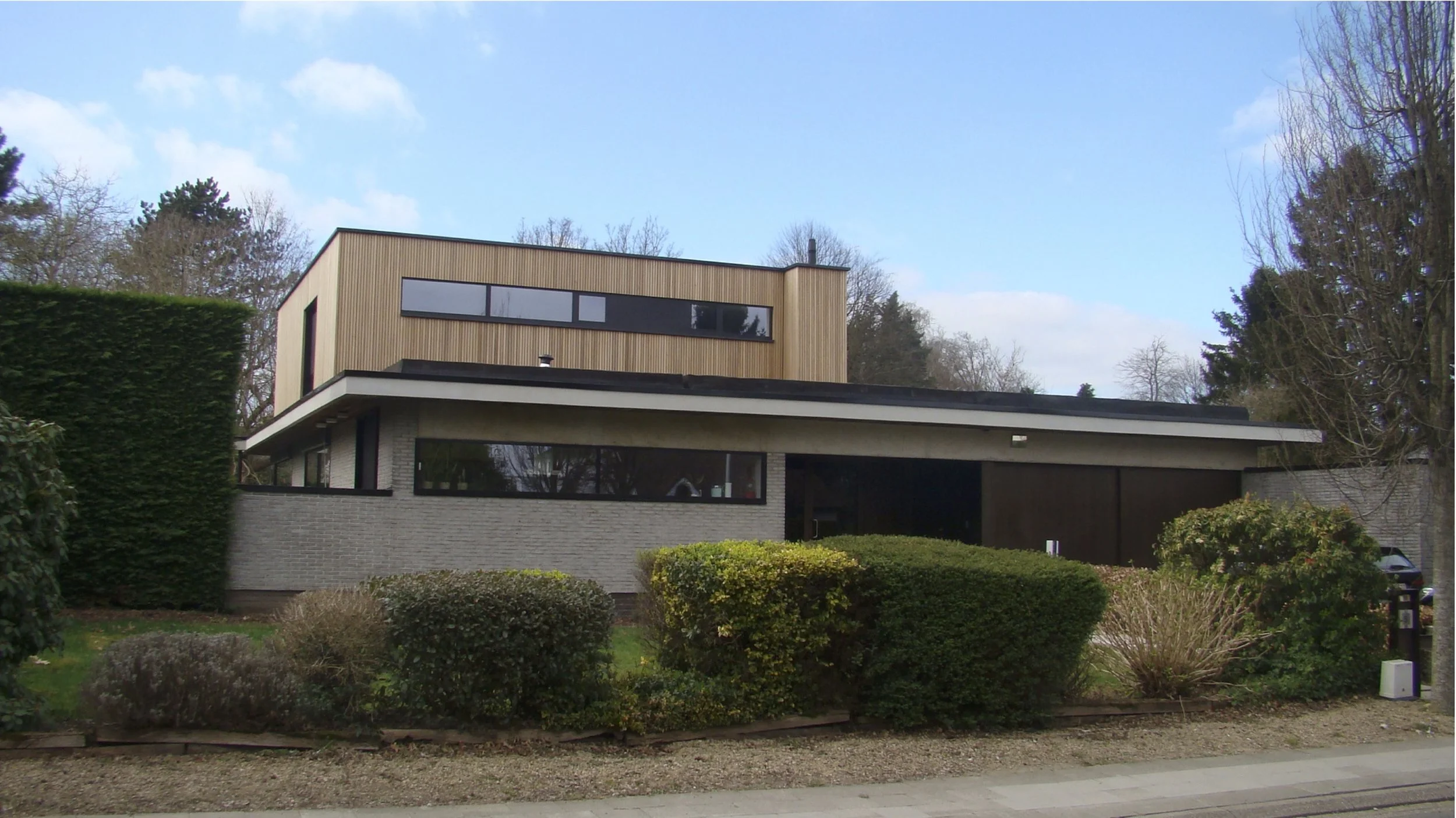 Een bestaande moderne woning krijgt een uitbreiding die sterk aansluit bij het oorspronkelijke ontwerp, maar zich ook onderscheidt in vorm en materiaalkeuze.